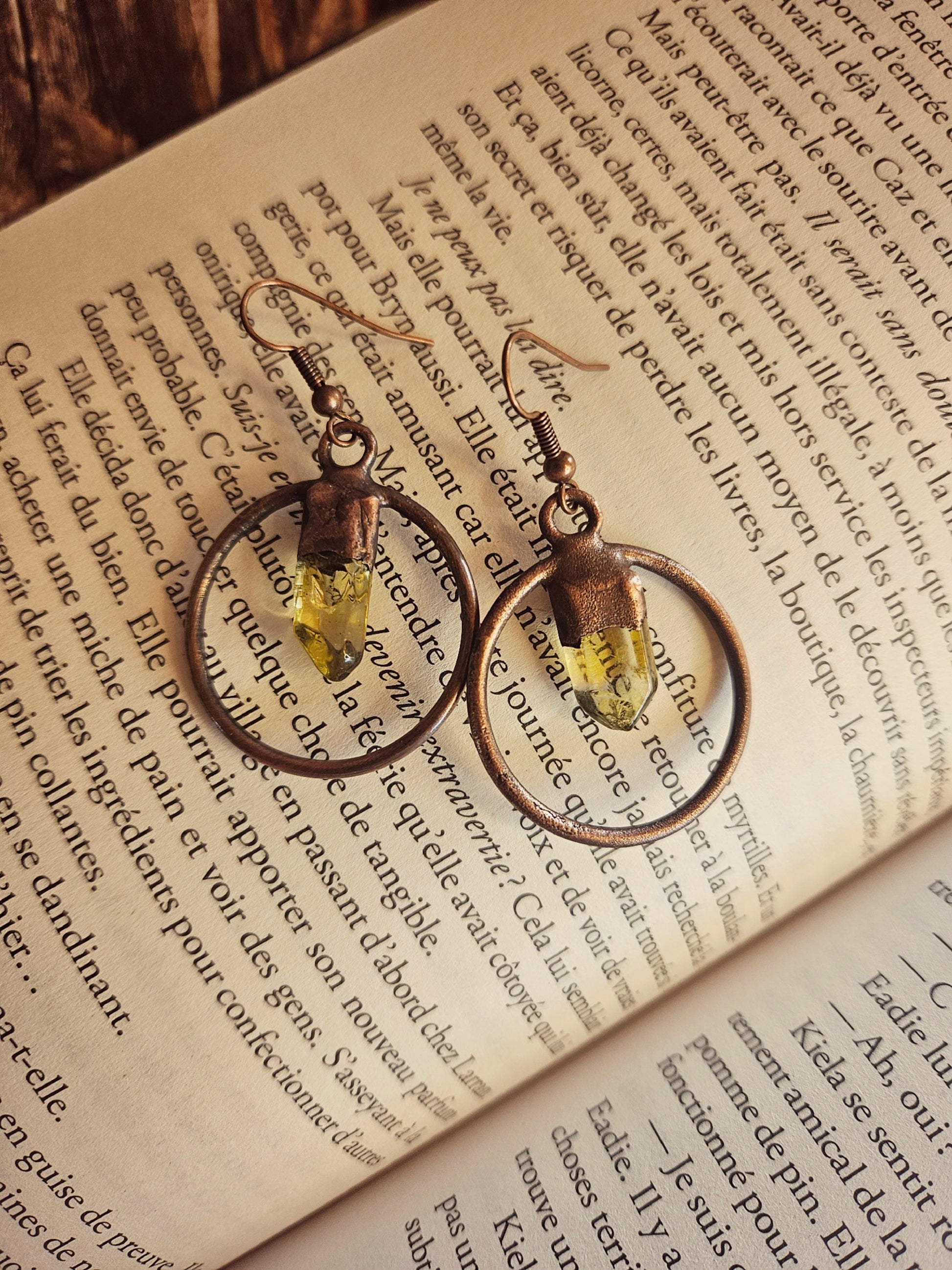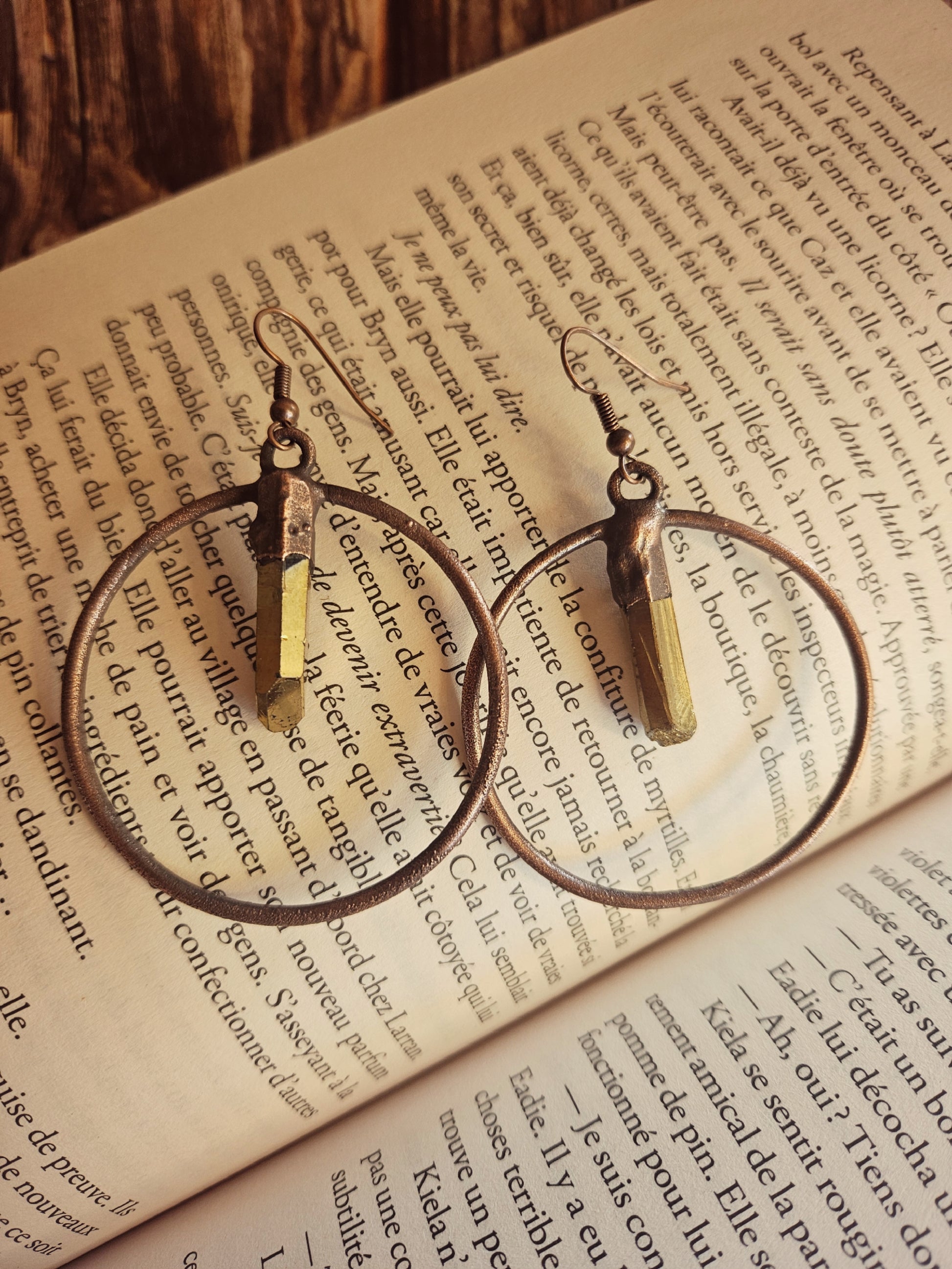 Ces boucles d’oreilles uniques sont façonnées en électroforming cuivre, où chaque cercle accueille un cristal vibrant d’énergie. Certaines paires sont ornées de Quartz Aura (quartz traité aux reflets irisés), d’autres de Tourmaline traitée, chaque pierre apportant sa propre intensité et sa magie.