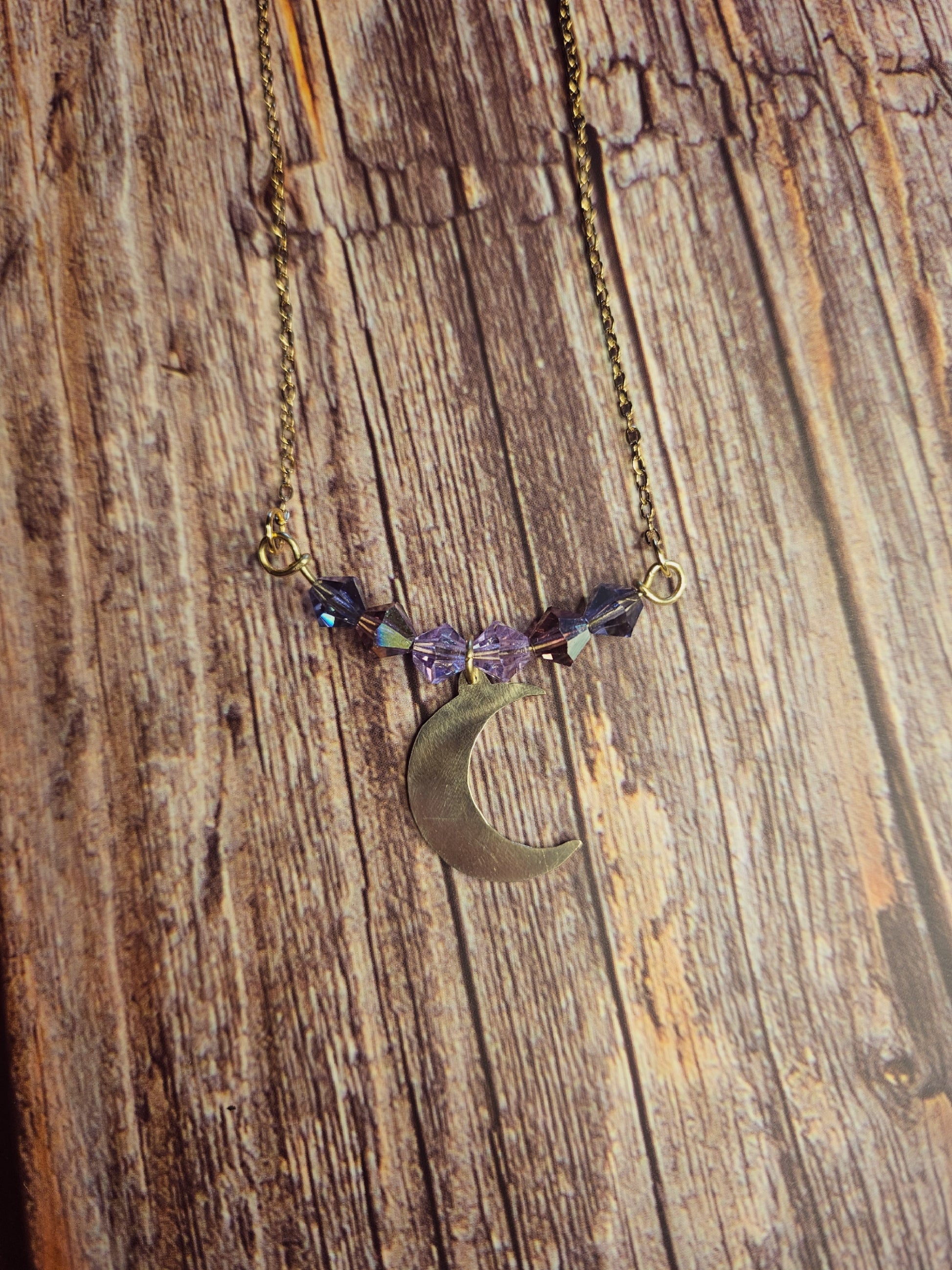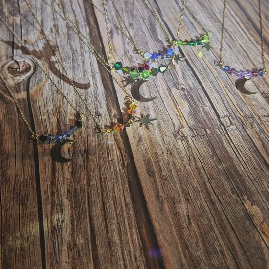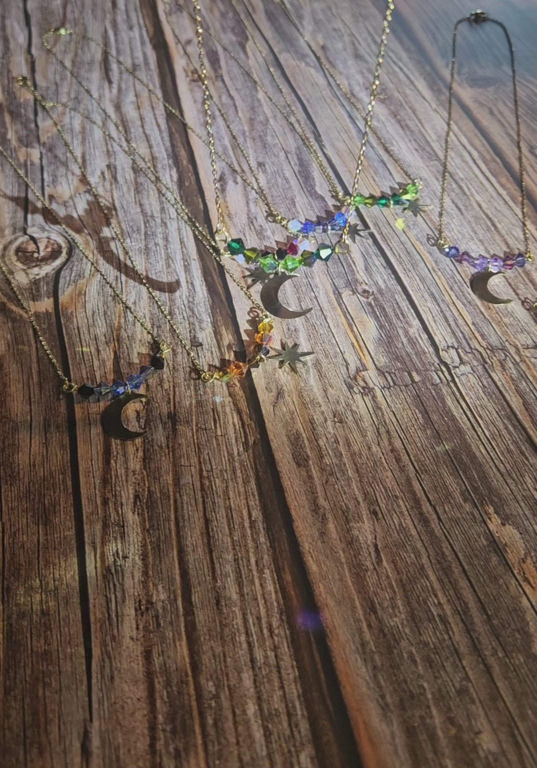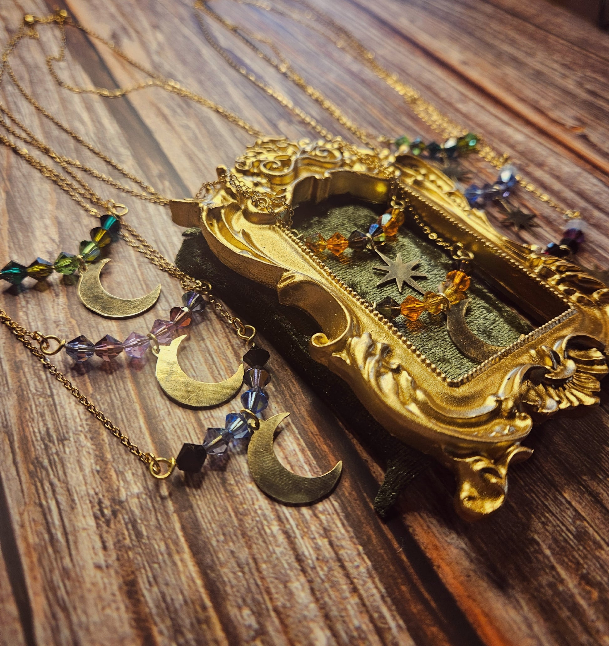 Entre lunes et étoiles façonnées à la main, ces bijoux mêlent la douceur du laiton à la lumière changeante des cristaux Preciosa, véritables fragments de ciel suspendus à votre cou.