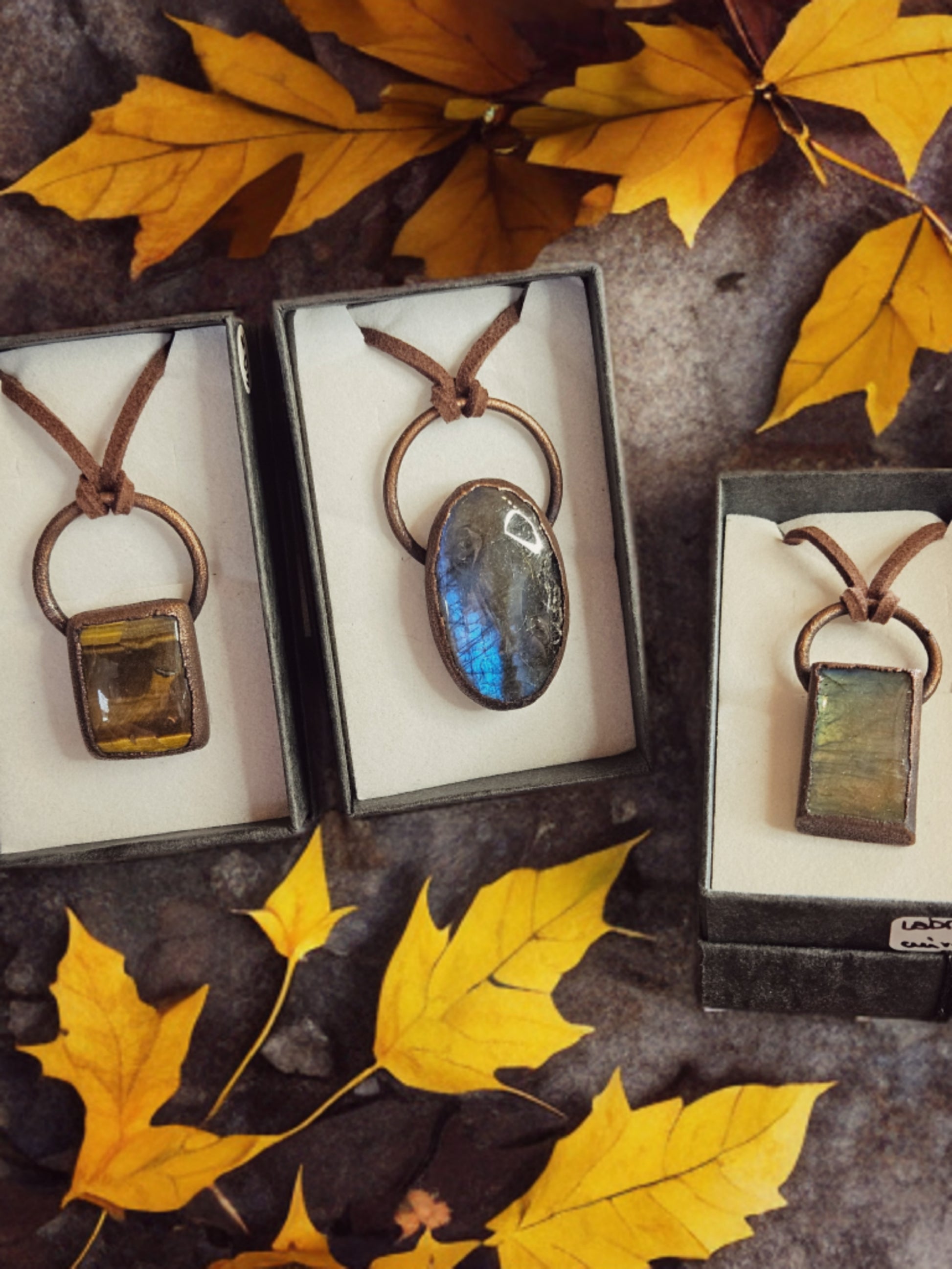 Montés sur cordons type daim marron, ajustables par nœud coulissant, ces pendentifs incarnent la transition des saisons et la beauté sauvage de l’équinoxe.