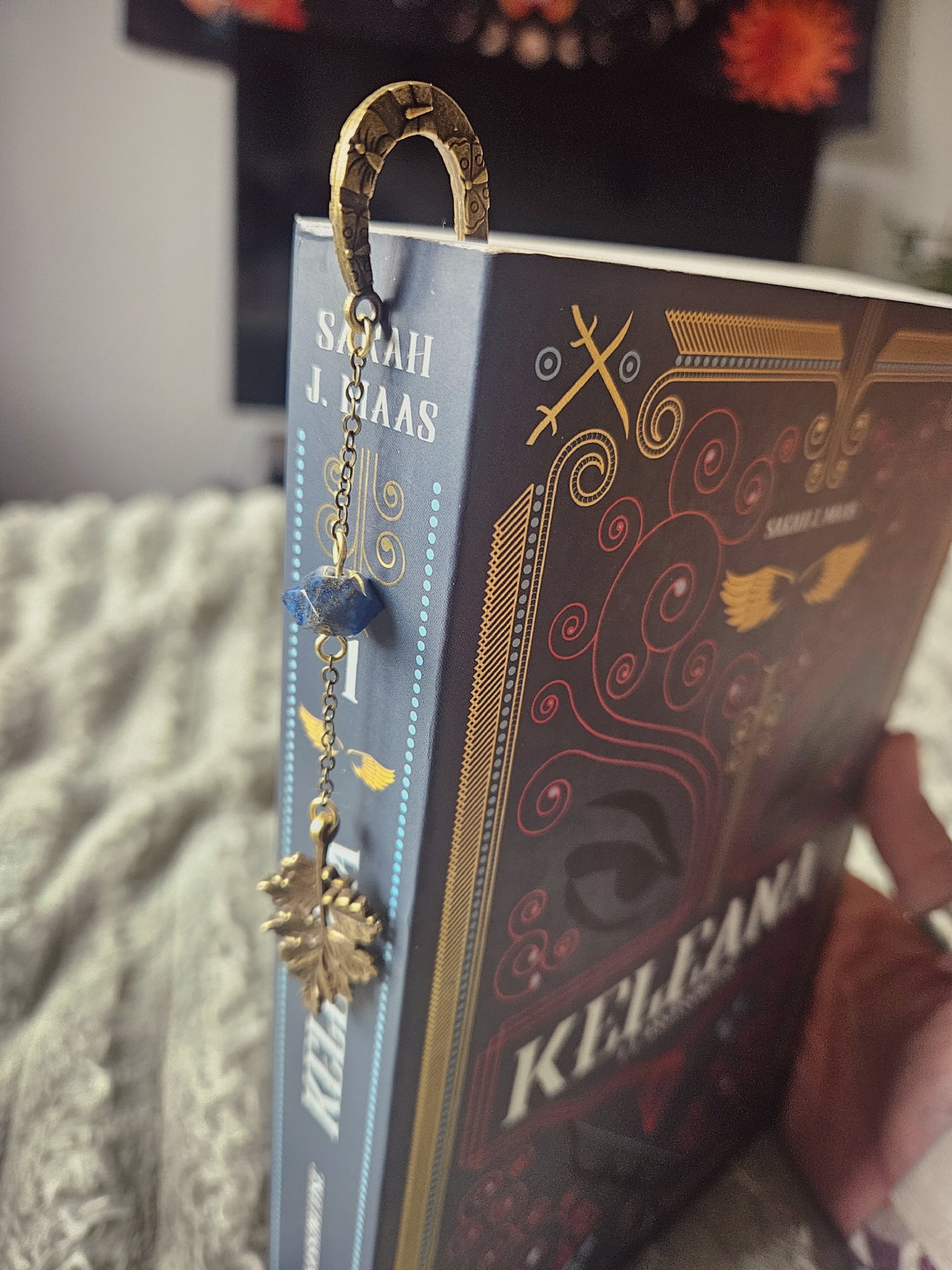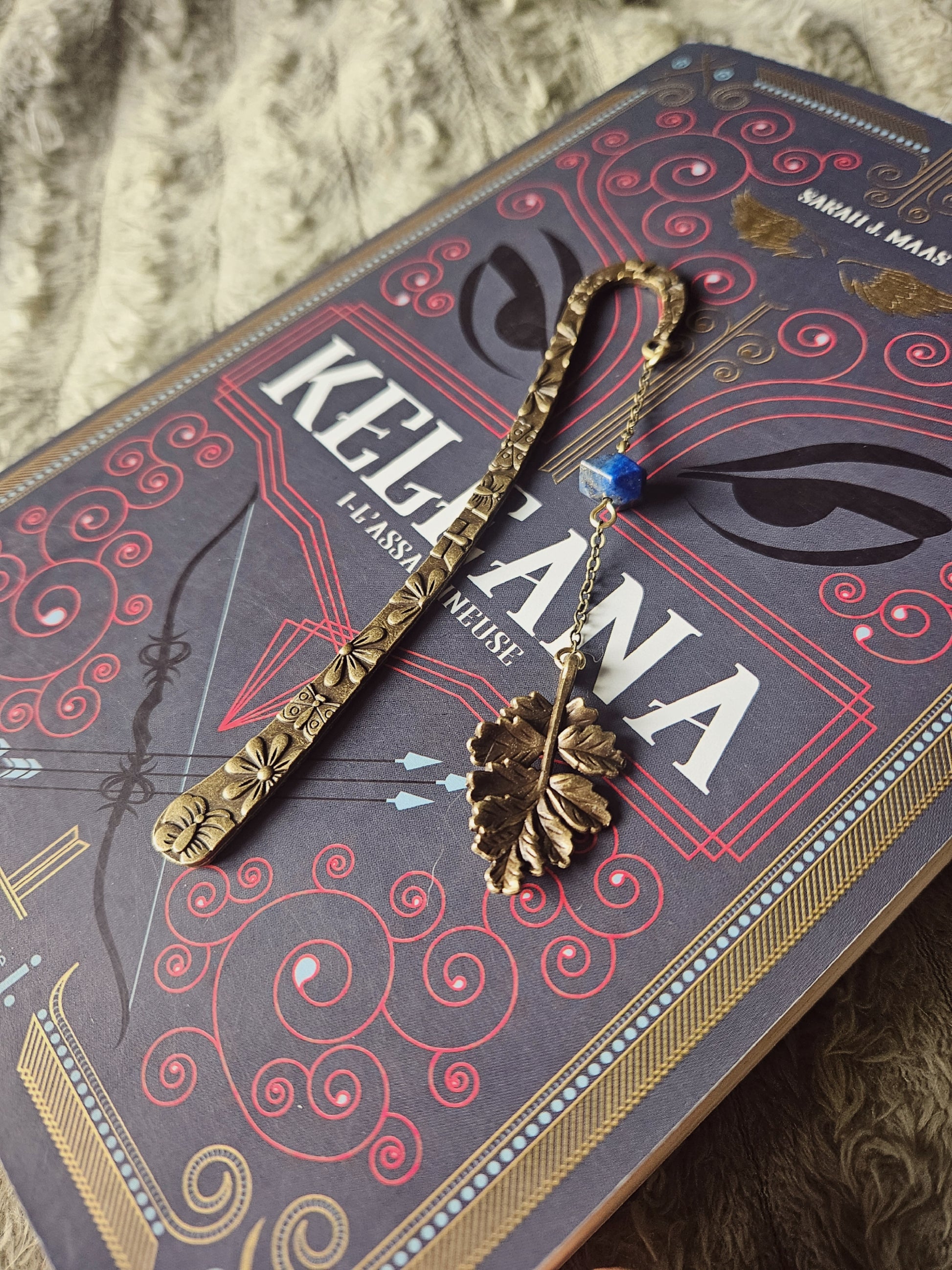 • Matière : marque-page, chaîne et feuille en métal doré vieilli ; anneaux en laiton