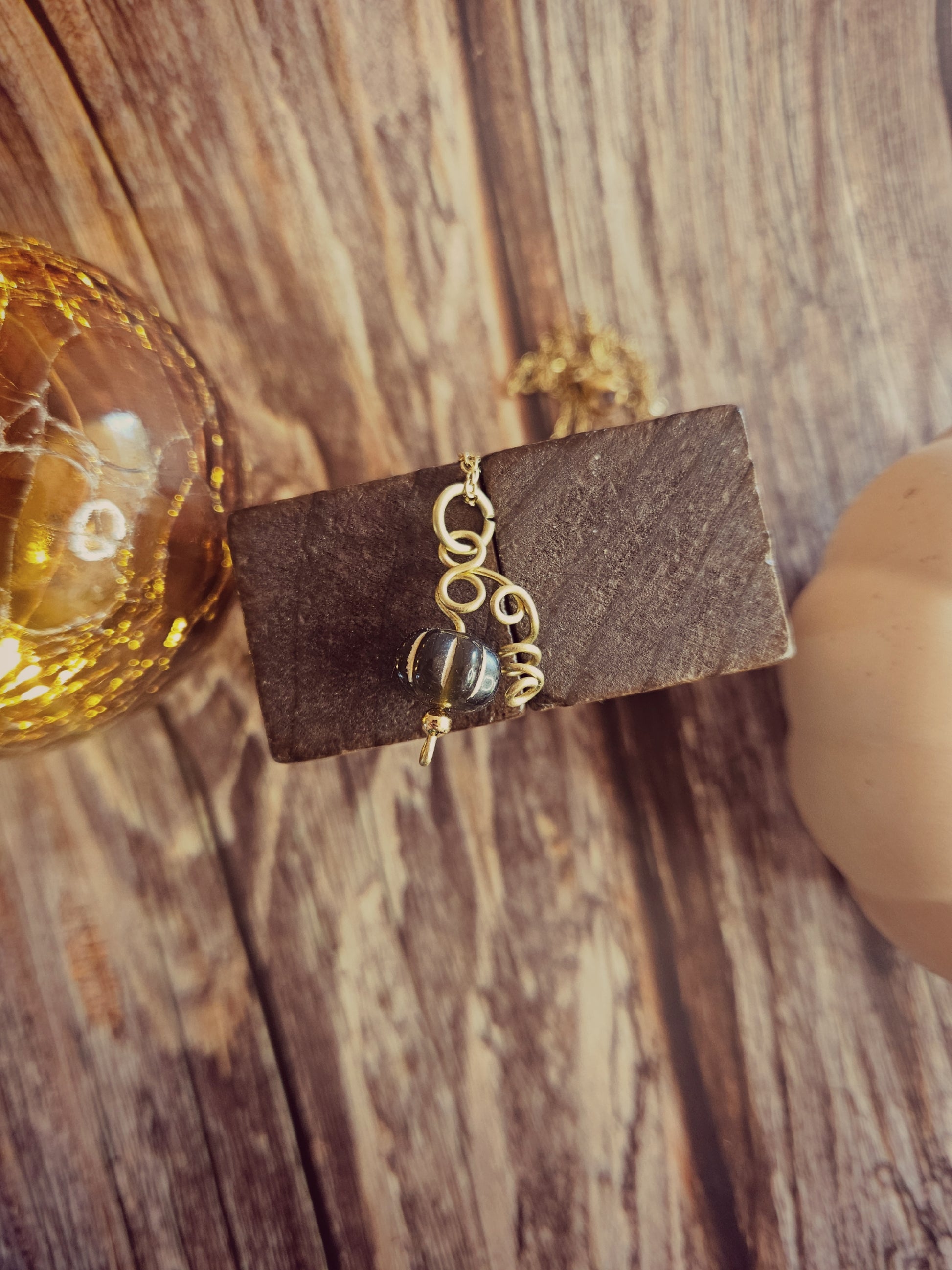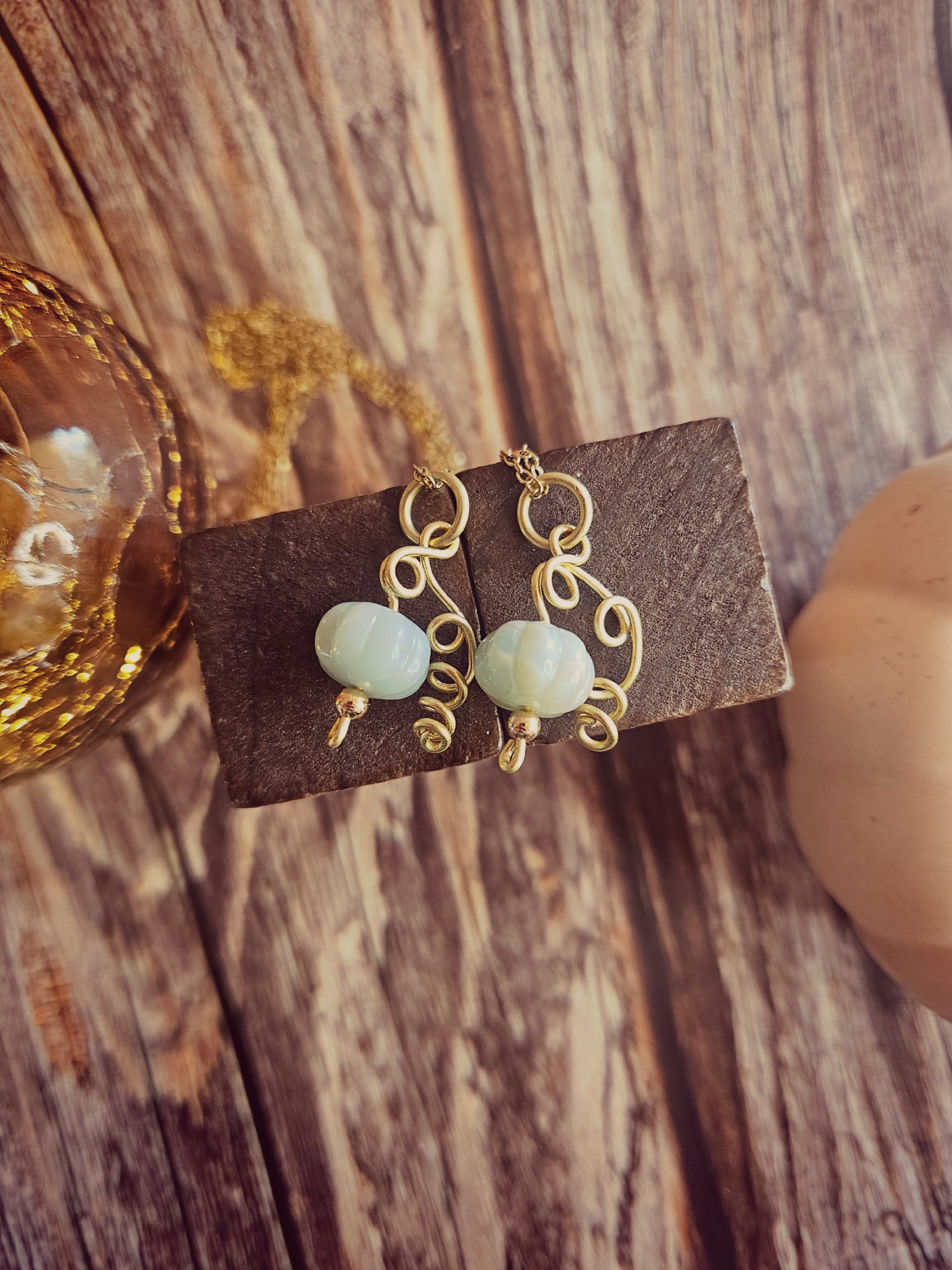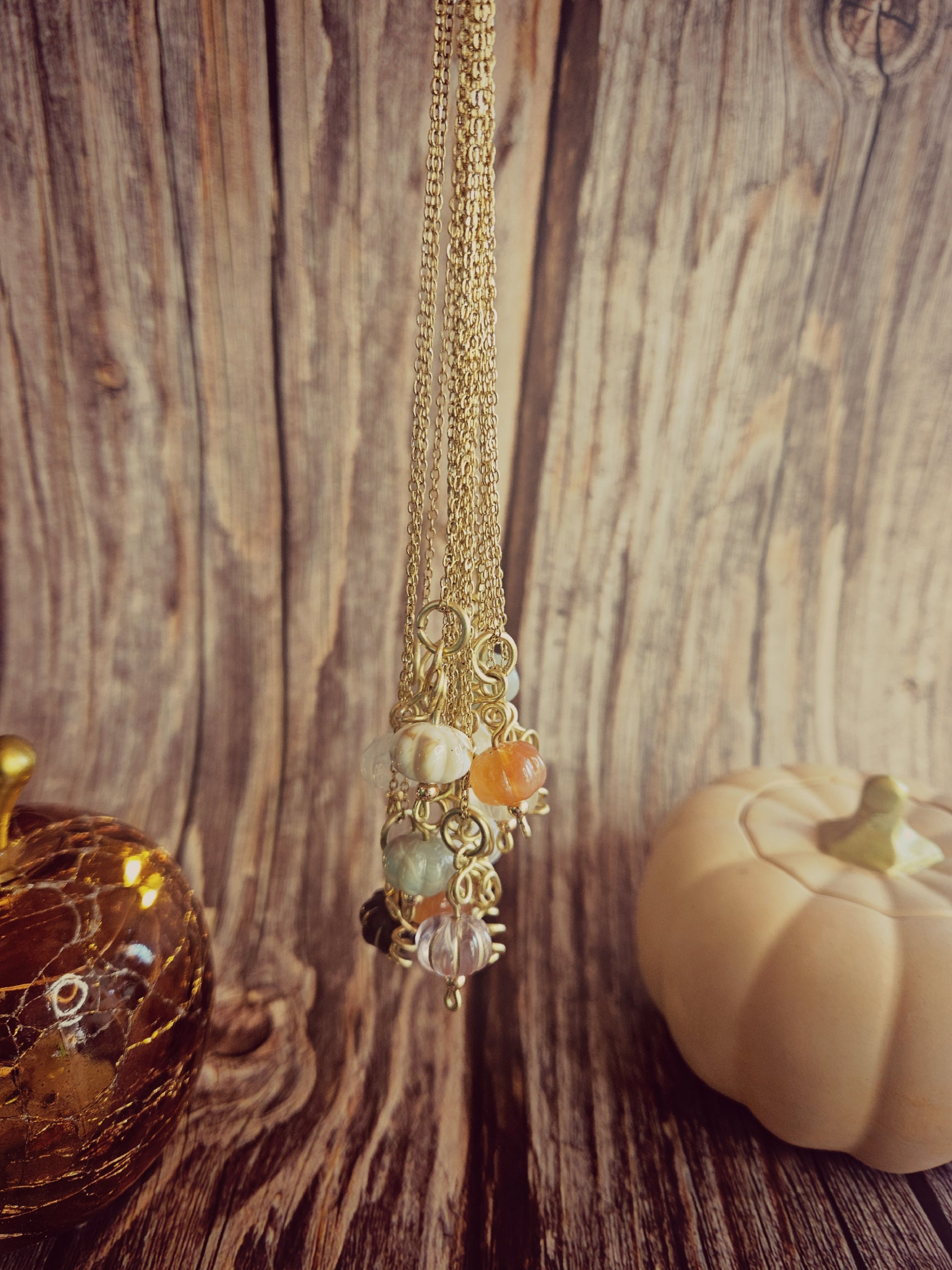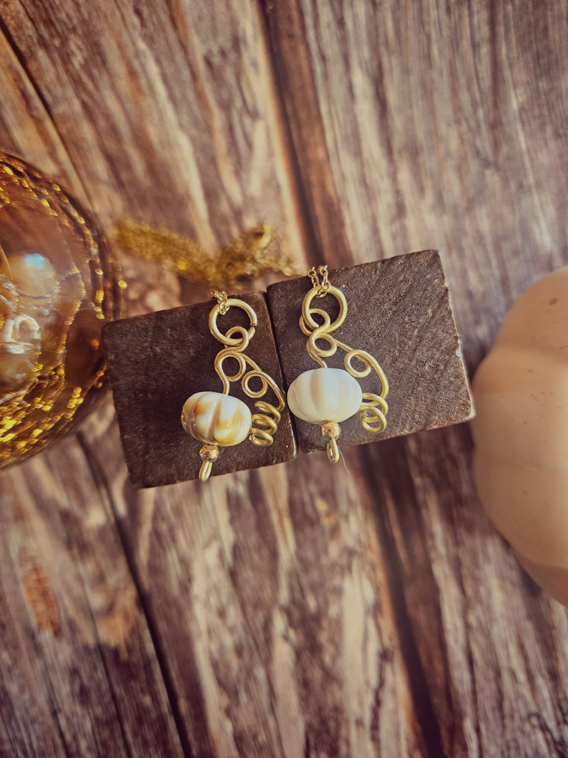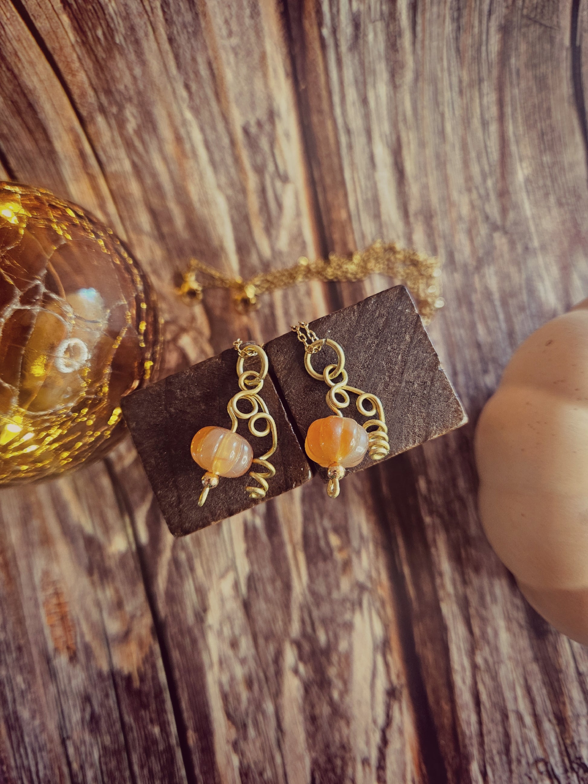 Ces pendentifs citrouilles en verre capturent toute la chaleur de la saison. Chaque pièce est unique : le pédoncule est façonné à la main en laiton, et la citrouille se termine par une petite bille dorée en acier inoxydable, pour un éclat délicat.