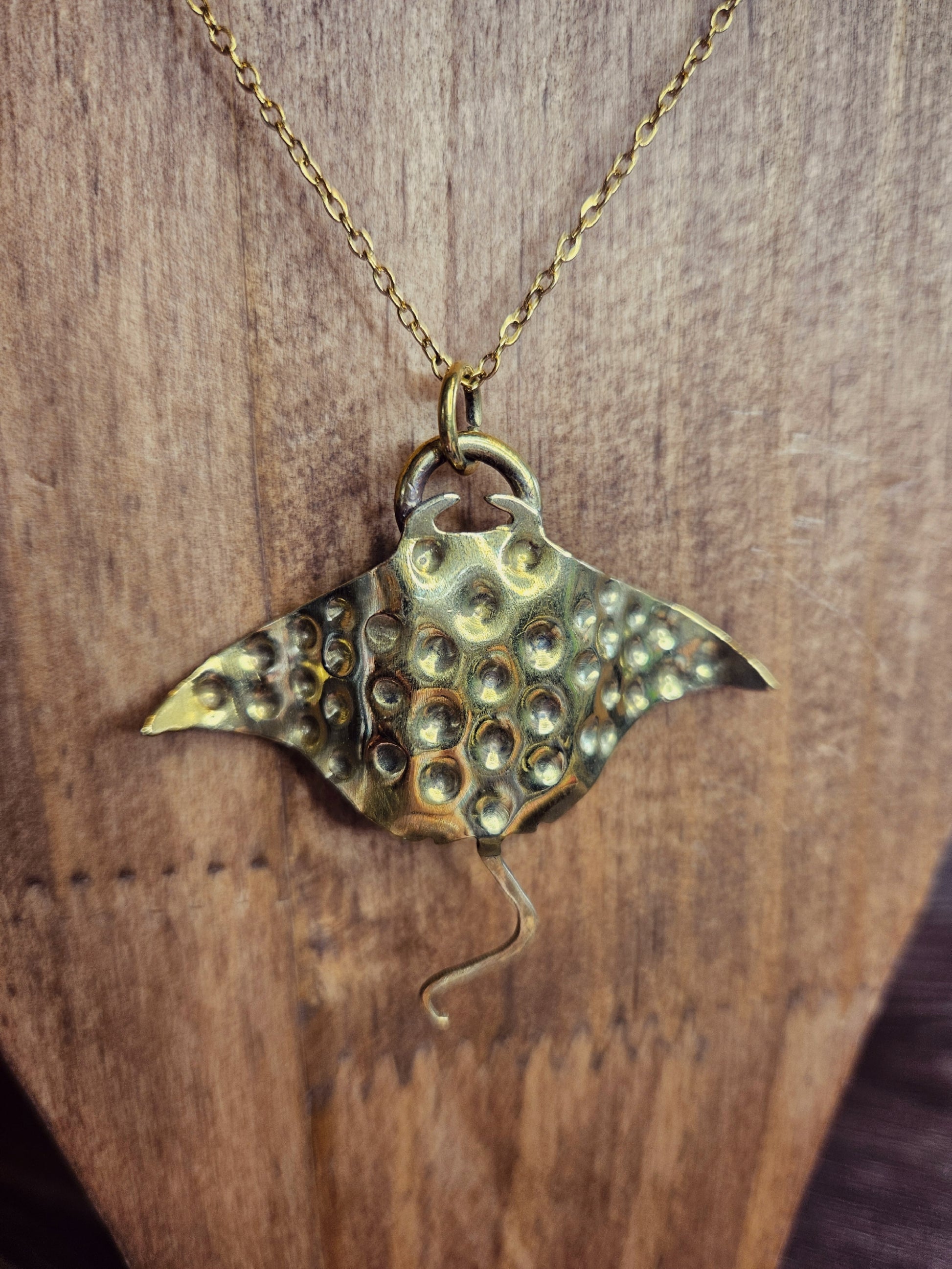Ce pendentif « Danse des Mantas », entièrement façonné à la main en laiton, rend hommage à cette créature majestueuse, symbole de liberté et d’harmonie. Son corps martelé reflète les jeux de lumière de la mer, et sa silhouette fluide vous invite à emporter avec vous un fragment de l’océan.
