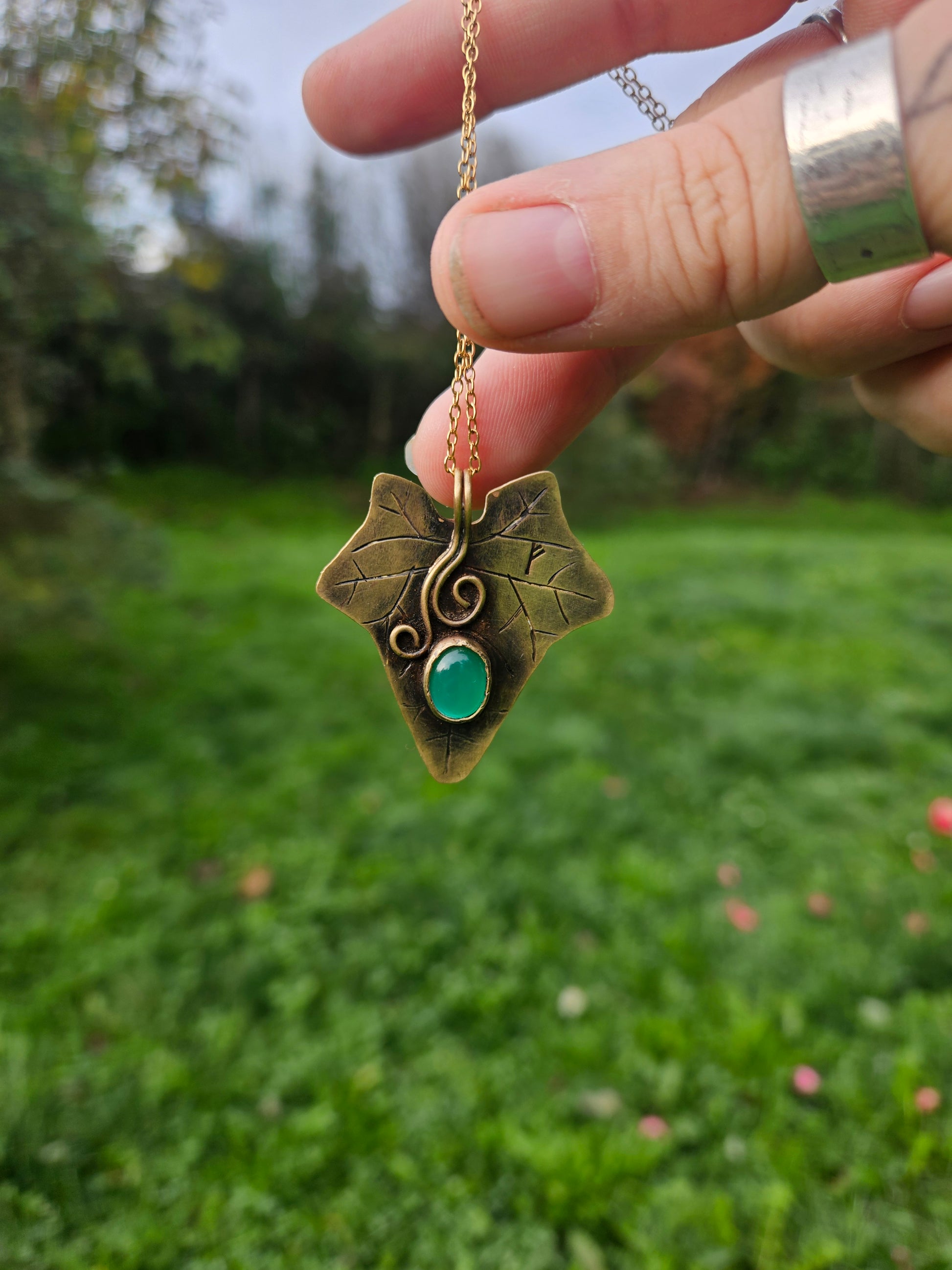 La feuille de lierre, elle, abrite un onyx vert, pierre d’ancrage et de persévérance.