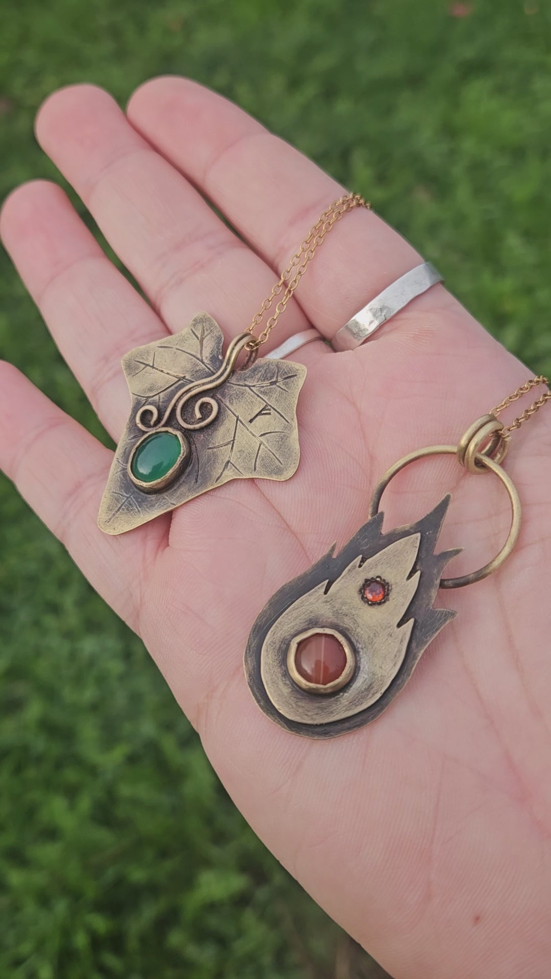 Ces pendentifs évoquent la rencontre du feu et de la terre, de la passion et du calme.