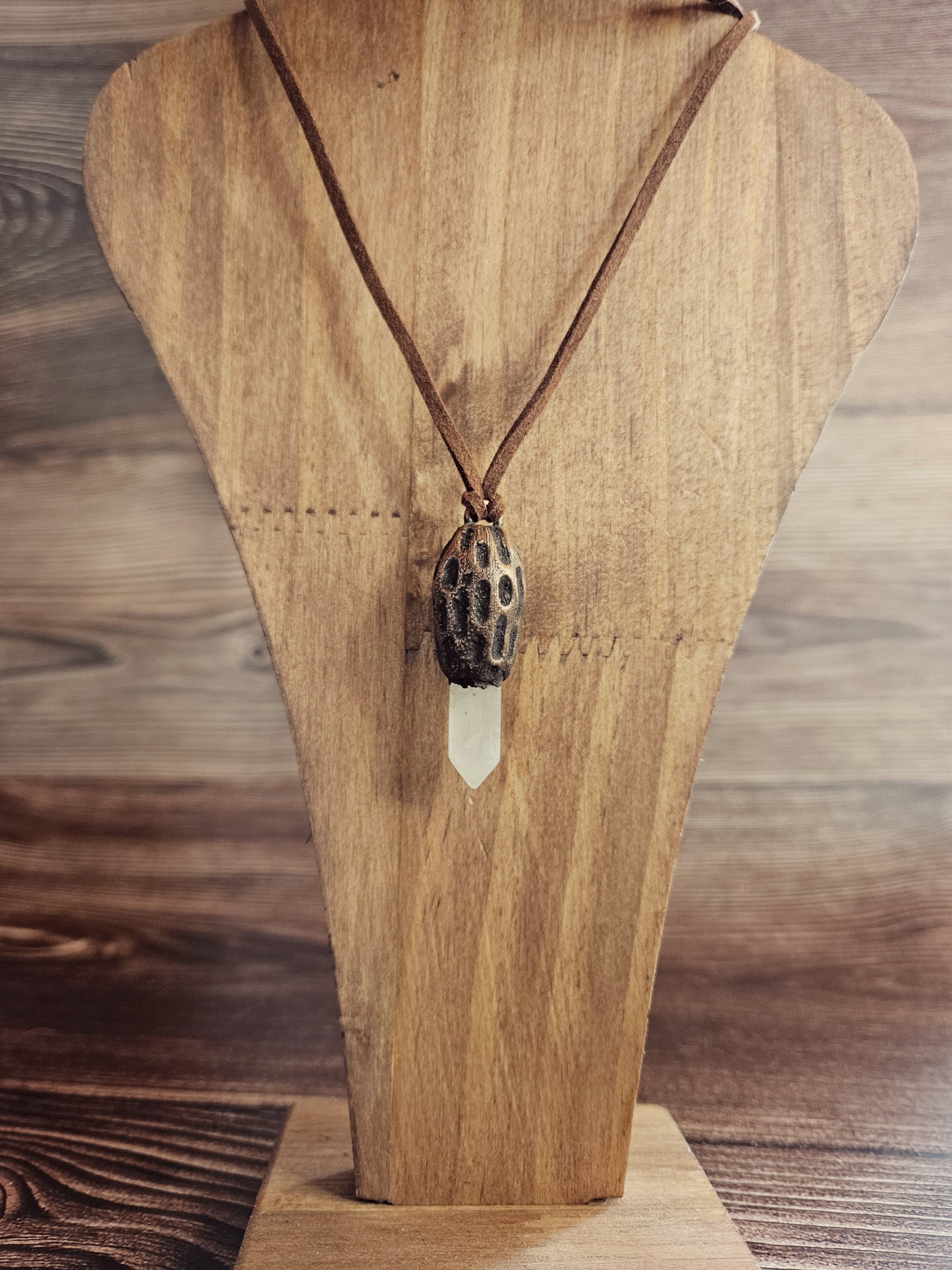 Les pierres sont serties dans une création unique en électroforming, façonnée pour représenter une morille grâce à un travail minutieux en argile polymère. Chaque pièce est montée sur un cordon type daim marron, ajustable par nœud coulissant, pour un porté confortable et naturel.
