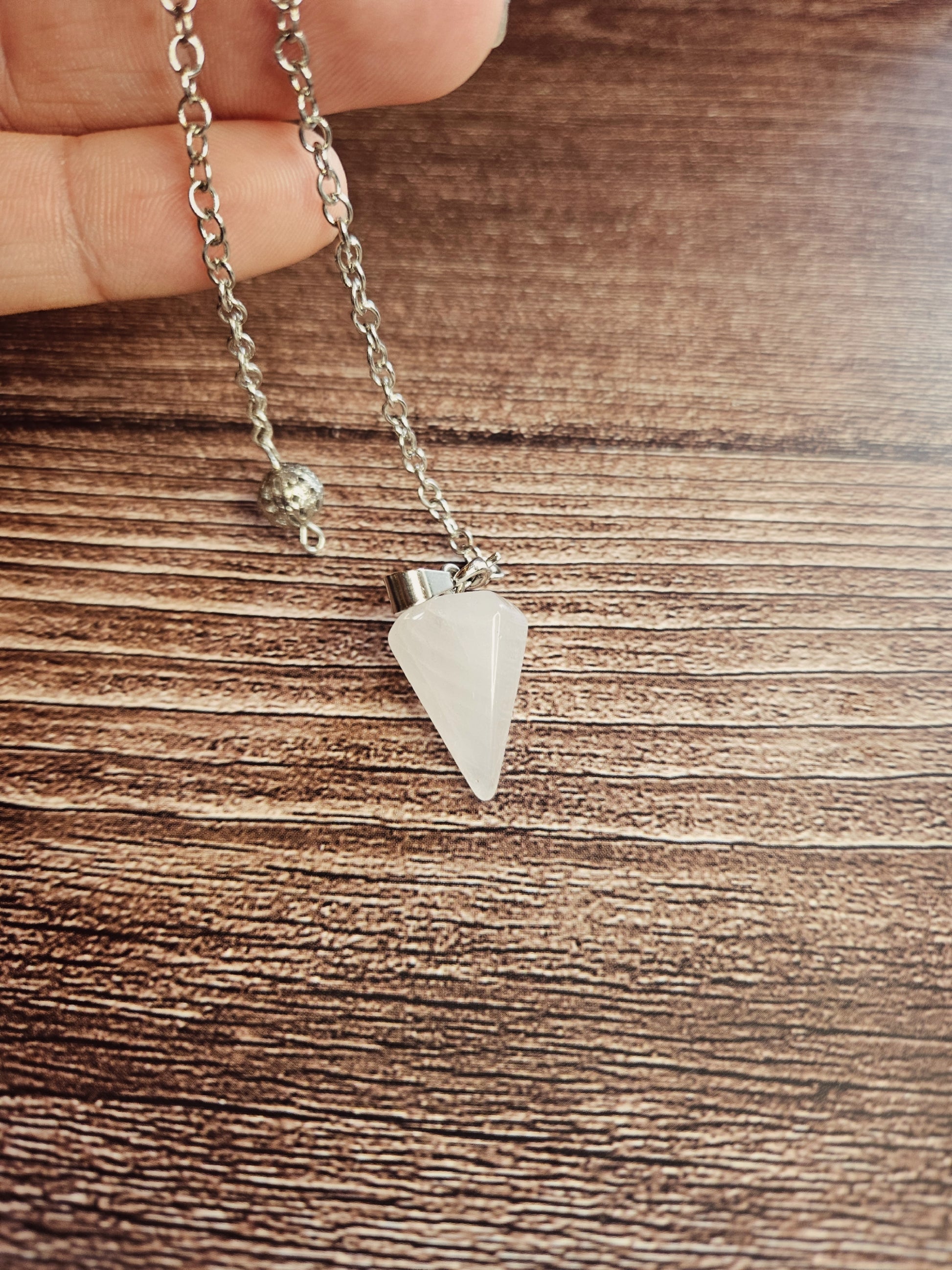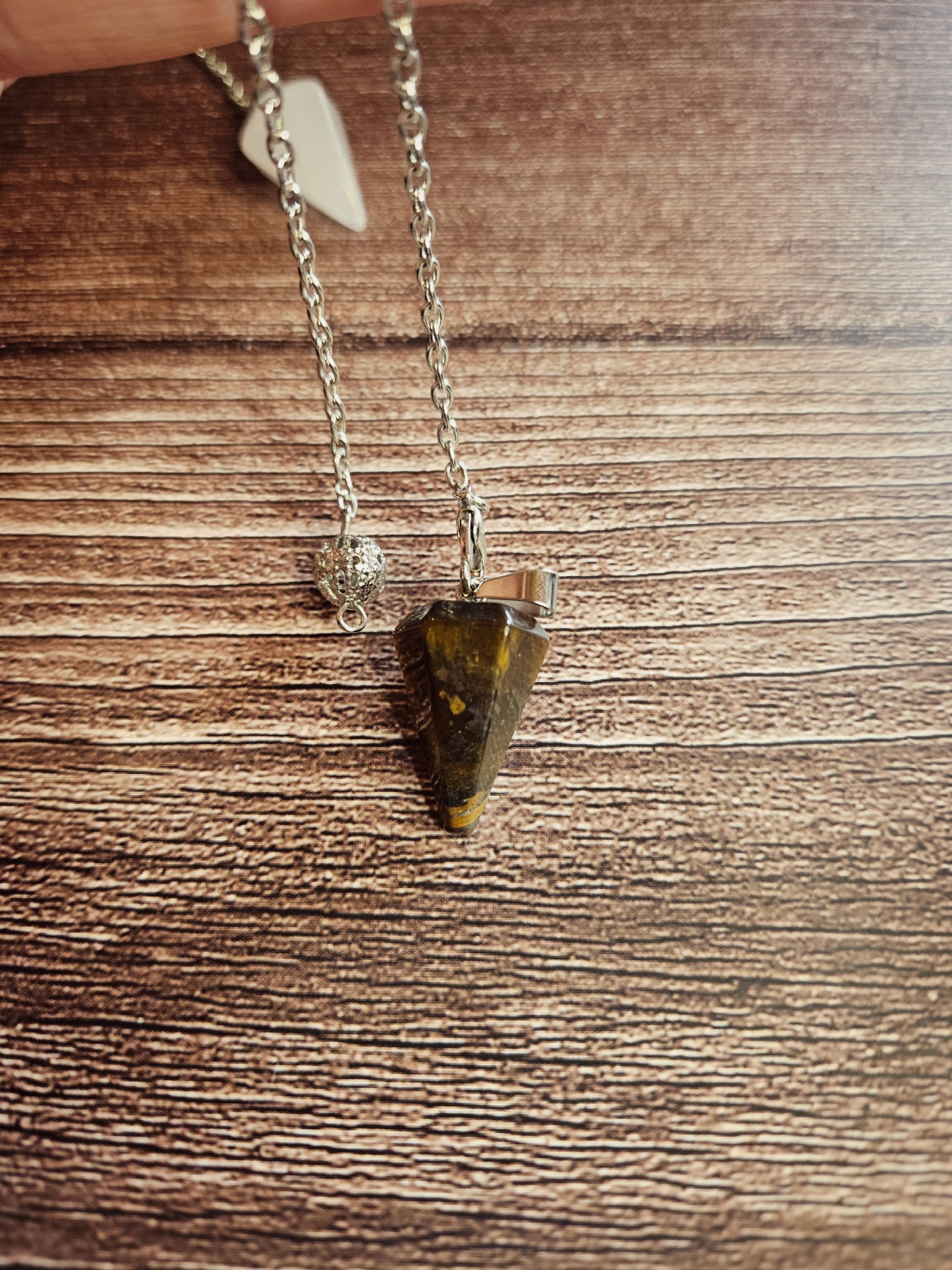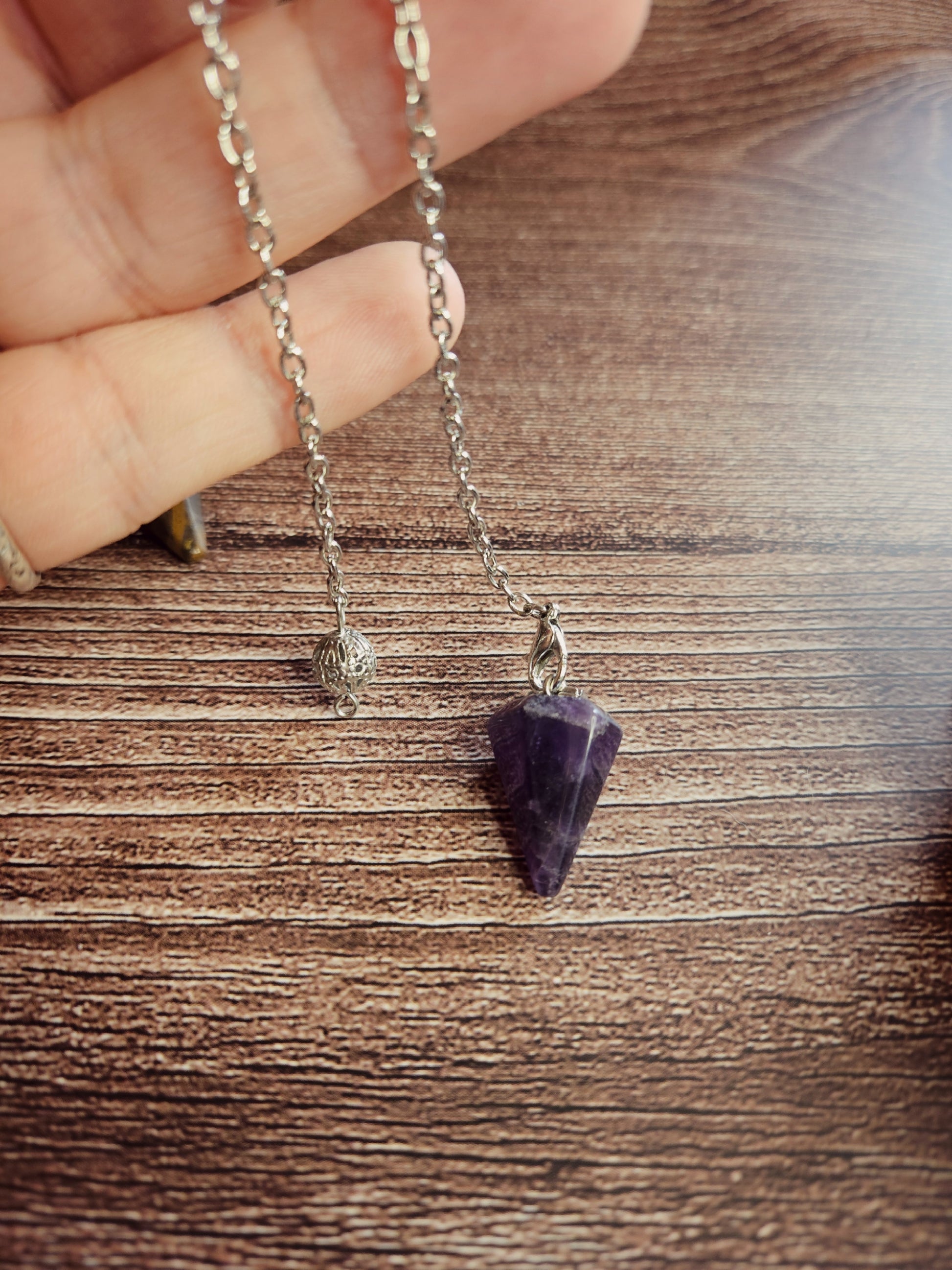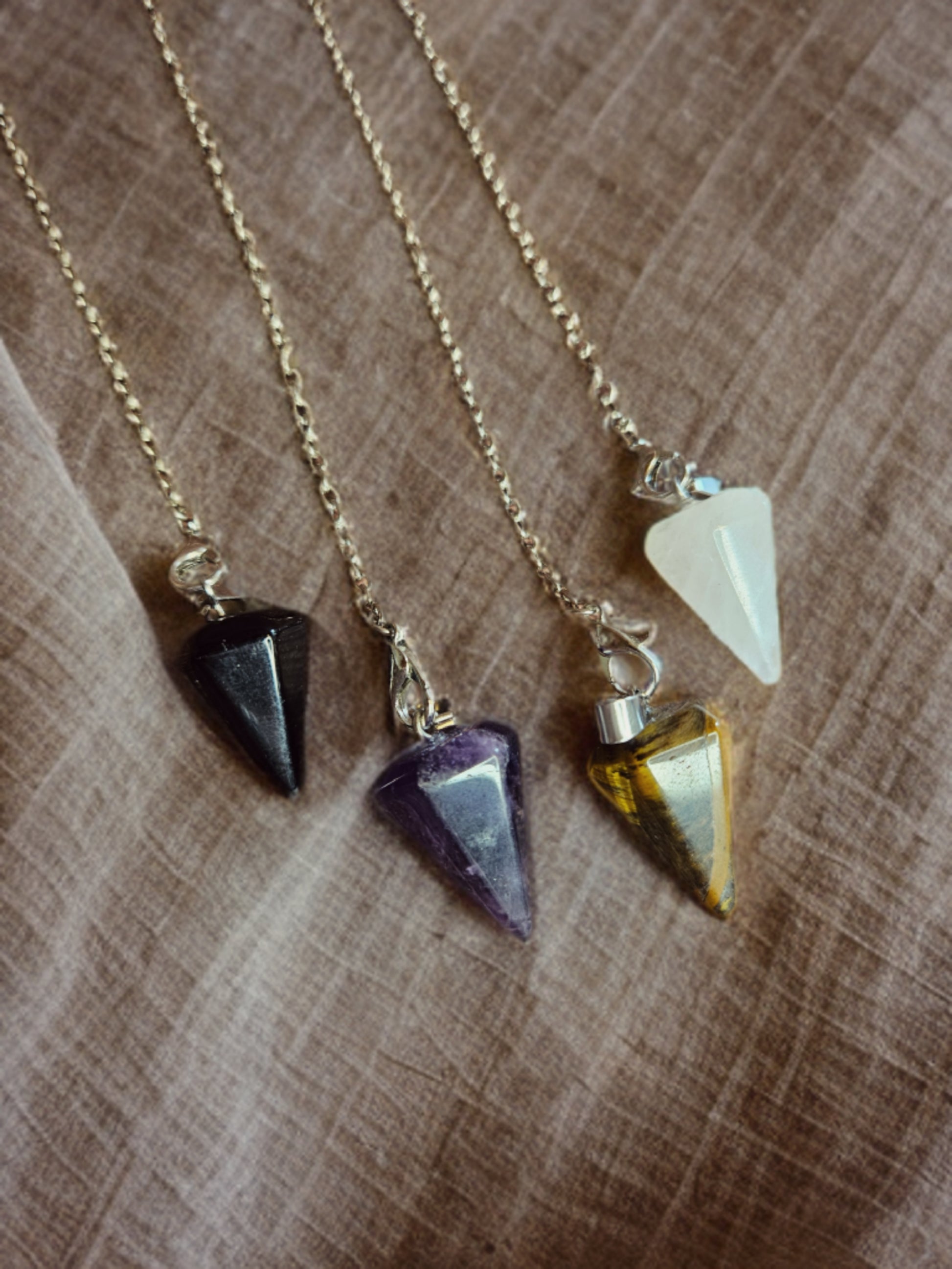 🔮 Pendule : Leur fonction première. Chaque pierre — obsidienne, améthyste, oeil de tigre et quartz rose — a été taillée en pointe pour accompagner vos tirages et vos questionnements intérieurs.