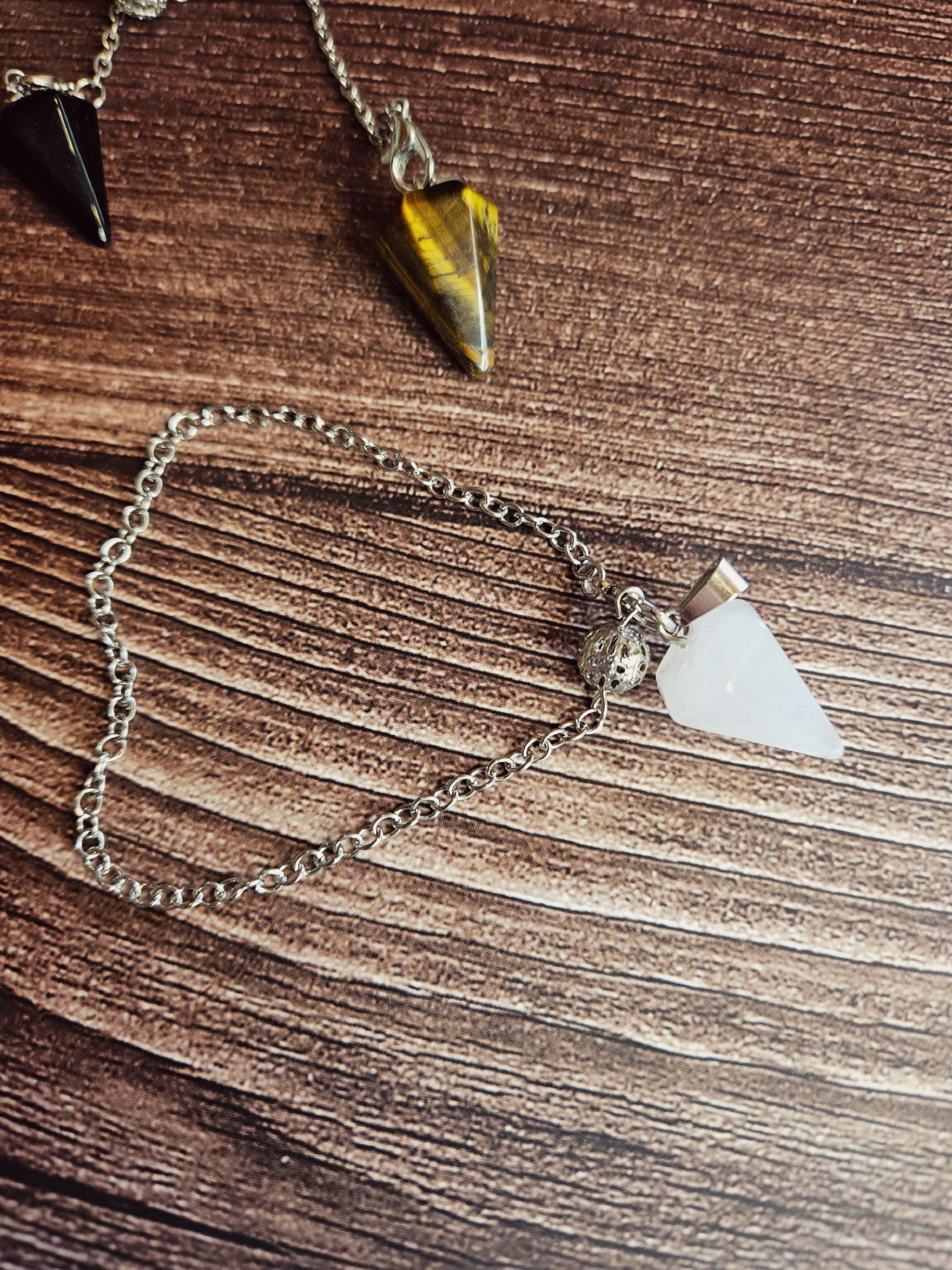 Ces pendules « Trinité des Chemins » portent en eux la liberté de se transformer : talismans de recherche, ornements de poignet ou pendentifs à garder près du cœur.